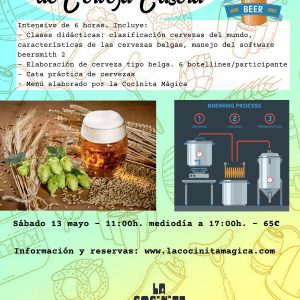 Taller didáctico y práctico que contiene tanto los conocimientos para distinguir los distintos tipos de cerveza, como una cata para disfrutarlas y un taller de elaboración de una variedad de cerveza belga. En el descanso aprovecharemos para comer un menú elaborado por La Cocinita Mágica.