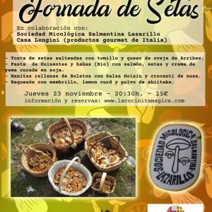 Evento donde haremos showcooking de diversas recetas con setas, además que tendremos con nosotros a la Presidenta de la Sociedad Micológica de Salamanca (Lazarillo), que nos contará curiosidades e información de las setas empleadas, así como de mundo micológico en general. Contaremos también con productos gourmet italianos gentileza de Casa Longini (Cta. Raqueta, 1, Bajo).