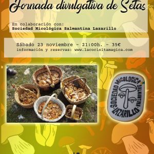 Jornada en la que miembros de la sociedad micológica Lazarillo de Salamanca nos explicarán la campaña de setas, nos enseñarán ejemplares de estas fechas, y haremos una cena Showcooking de cuatro platos, con setas; para los asistentes. También ofreceremos bebida y refrescos.✨✨✨